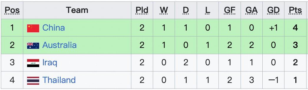 澳大利亚积6分出线,中国队与泰国队同积4分,中国队因胜负关系劣势出局。